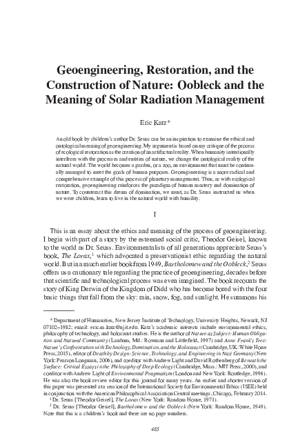 Pdf Geoengineering Restoration And The Construction Of Nature